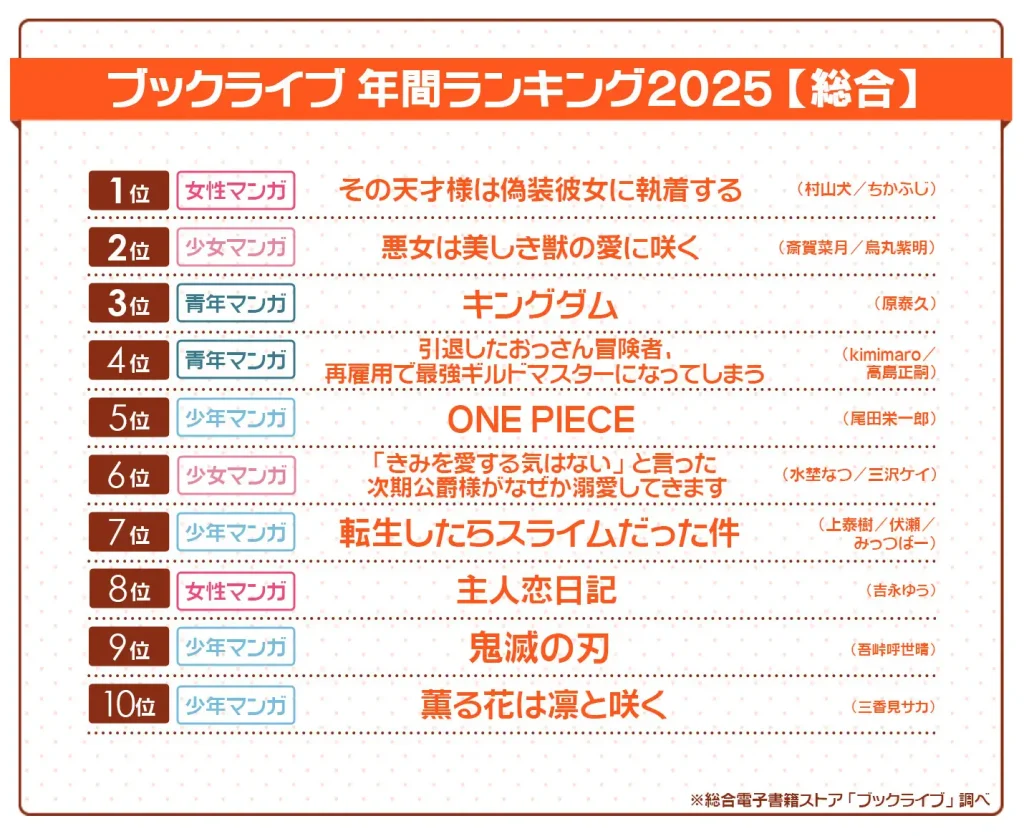 総合電子書籍ストア「ブックライブ」2025年の年間ランキングを発表